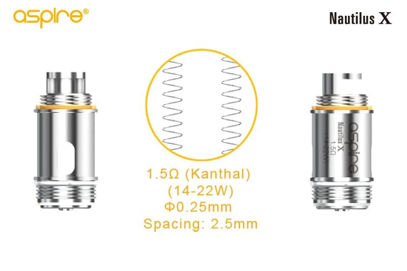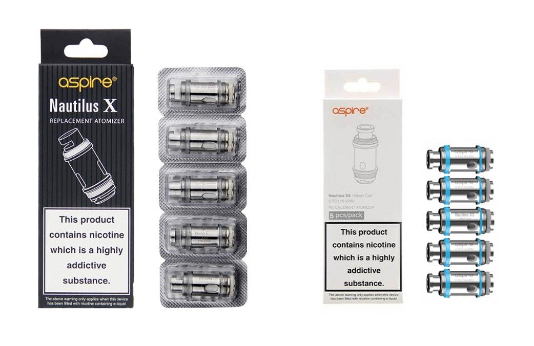 A Pack of 5 Aspire Nautilus X replacement coils available in 1.8 ohm (12-16W), 1.5 ohms (14-20W) and 0.7 Mesh Coil.